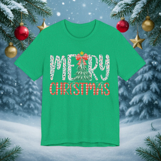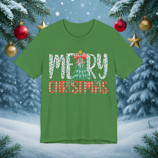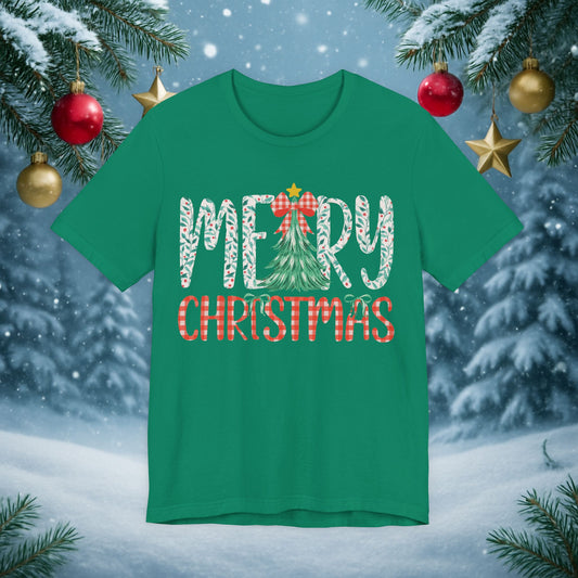 Merry Christmas Tee — Festive Tree & Plaid Holiday Shirt