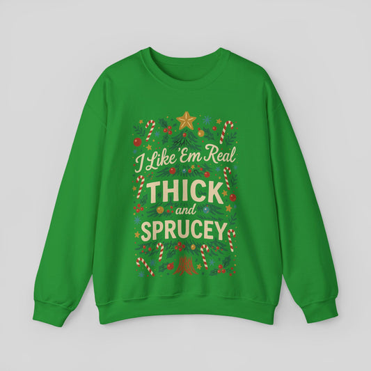 Christmas Sweatshirt - "I Like 'Em Real Thick and Sprucey" Holiday Crewneck