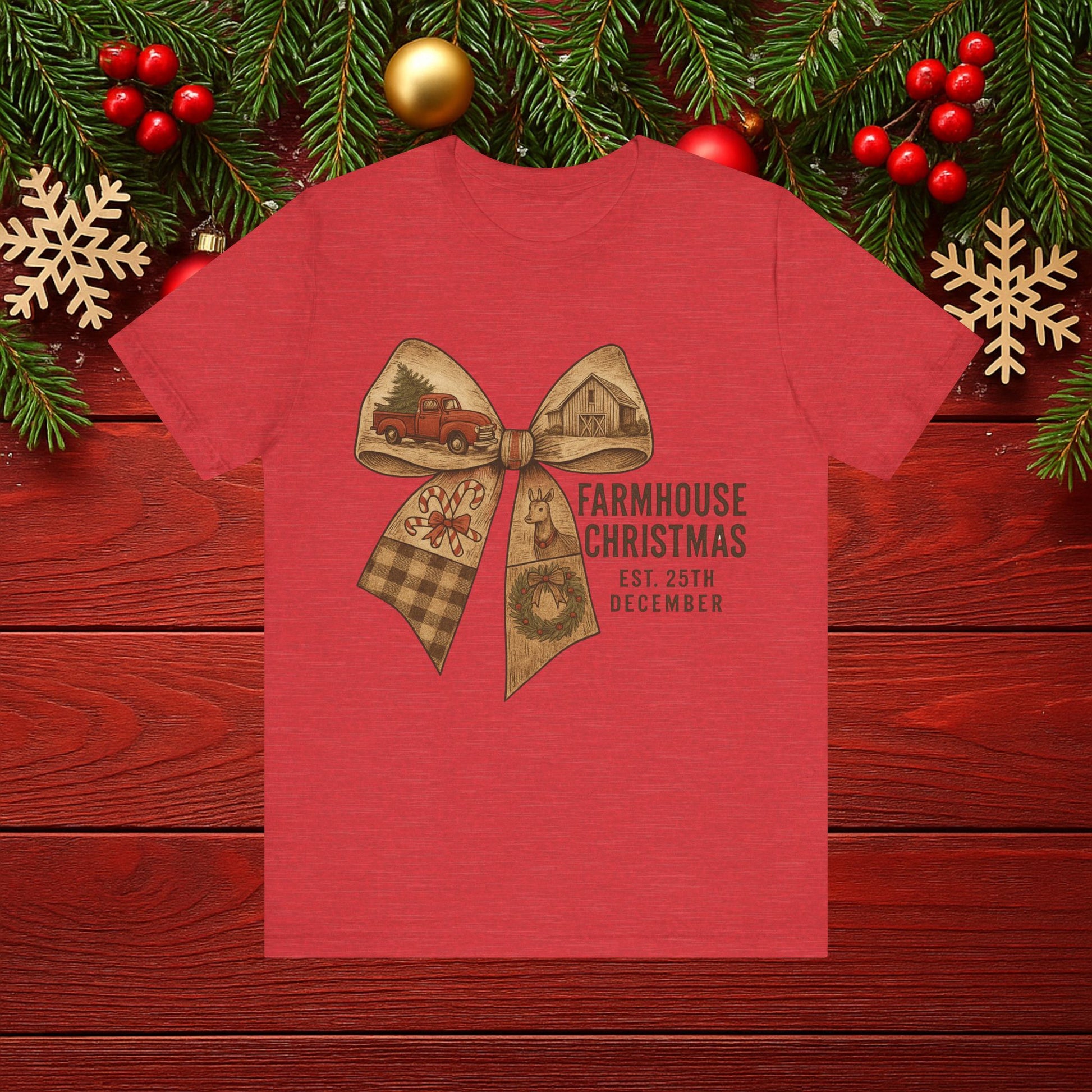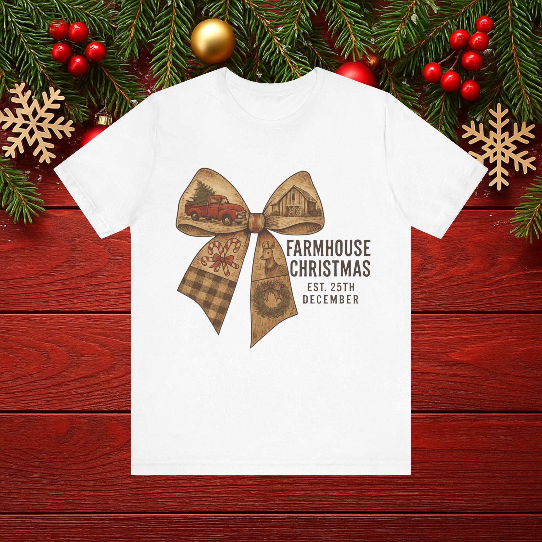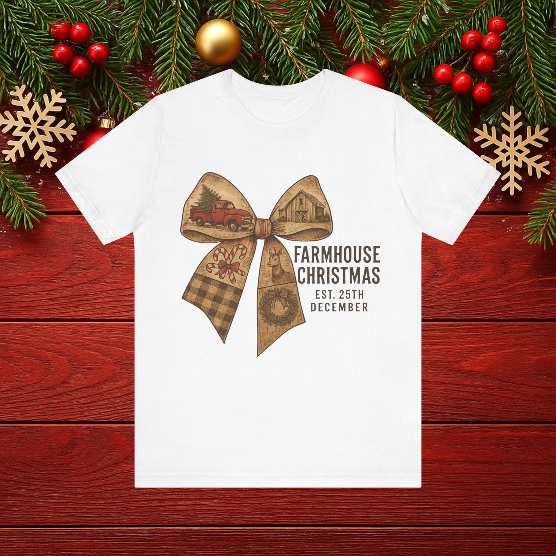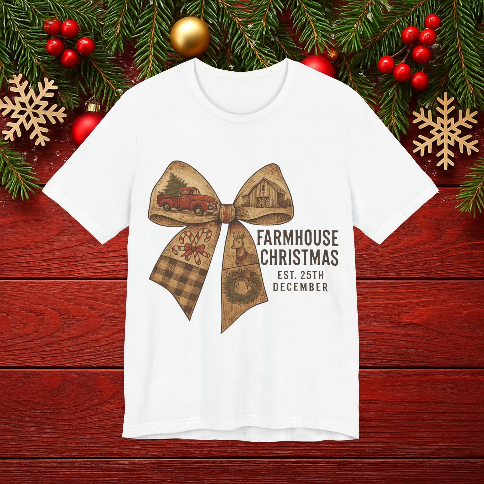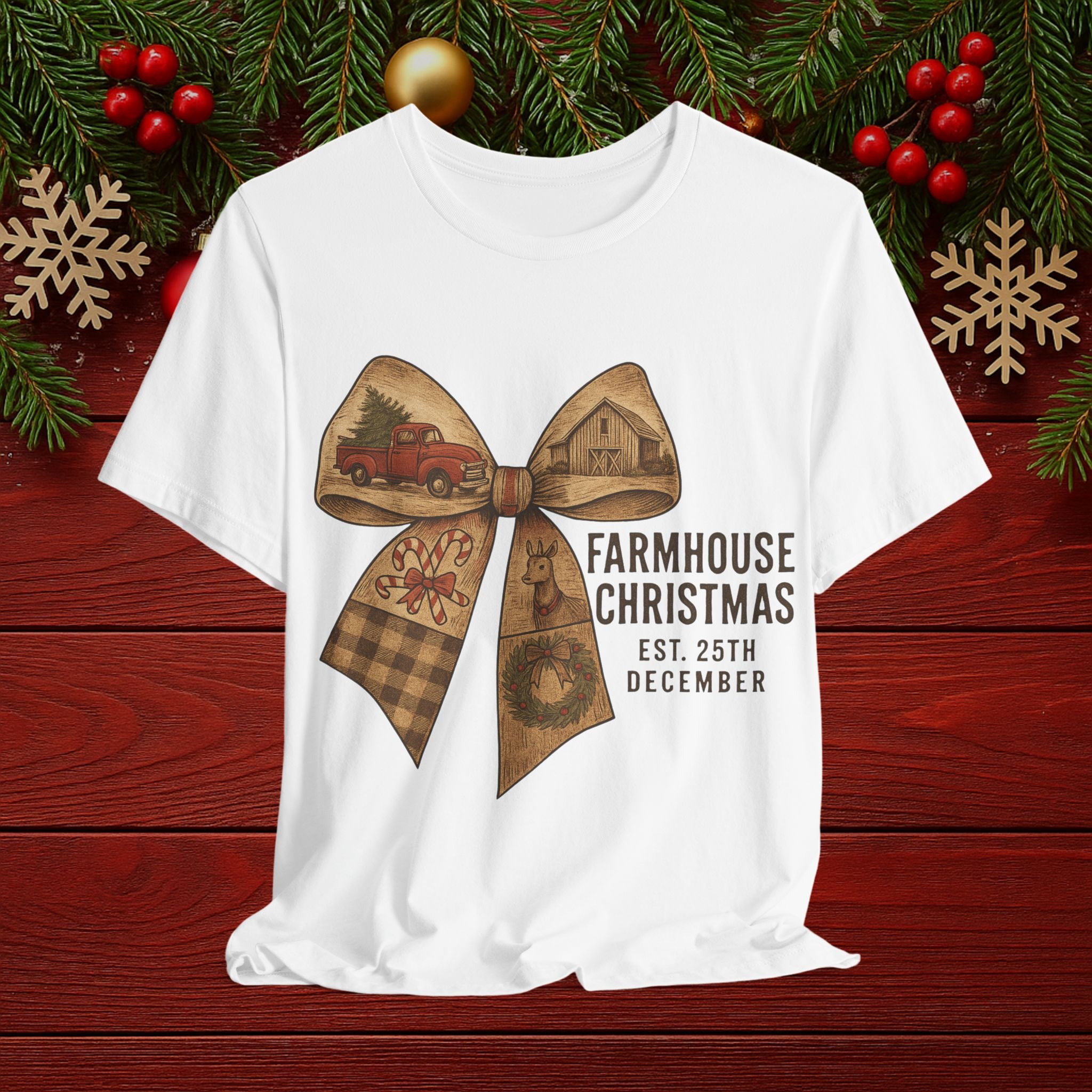 Farmhouse Christmas Tee – Rustic Bow 'Farmhouse Christmas EST. 25th December' Holiday Shirt