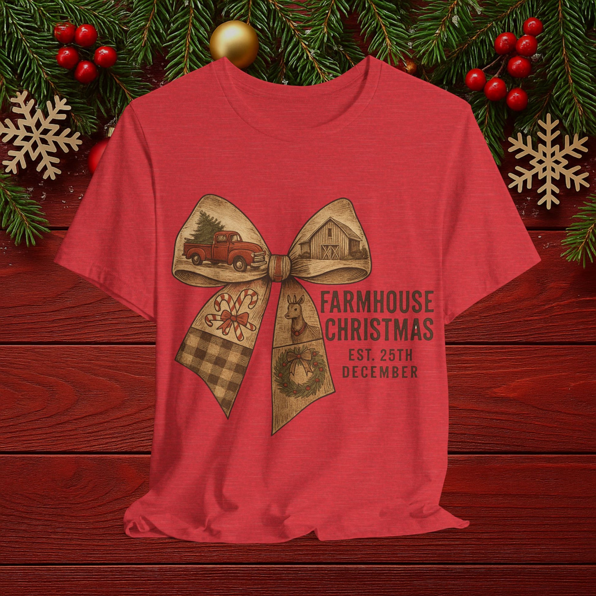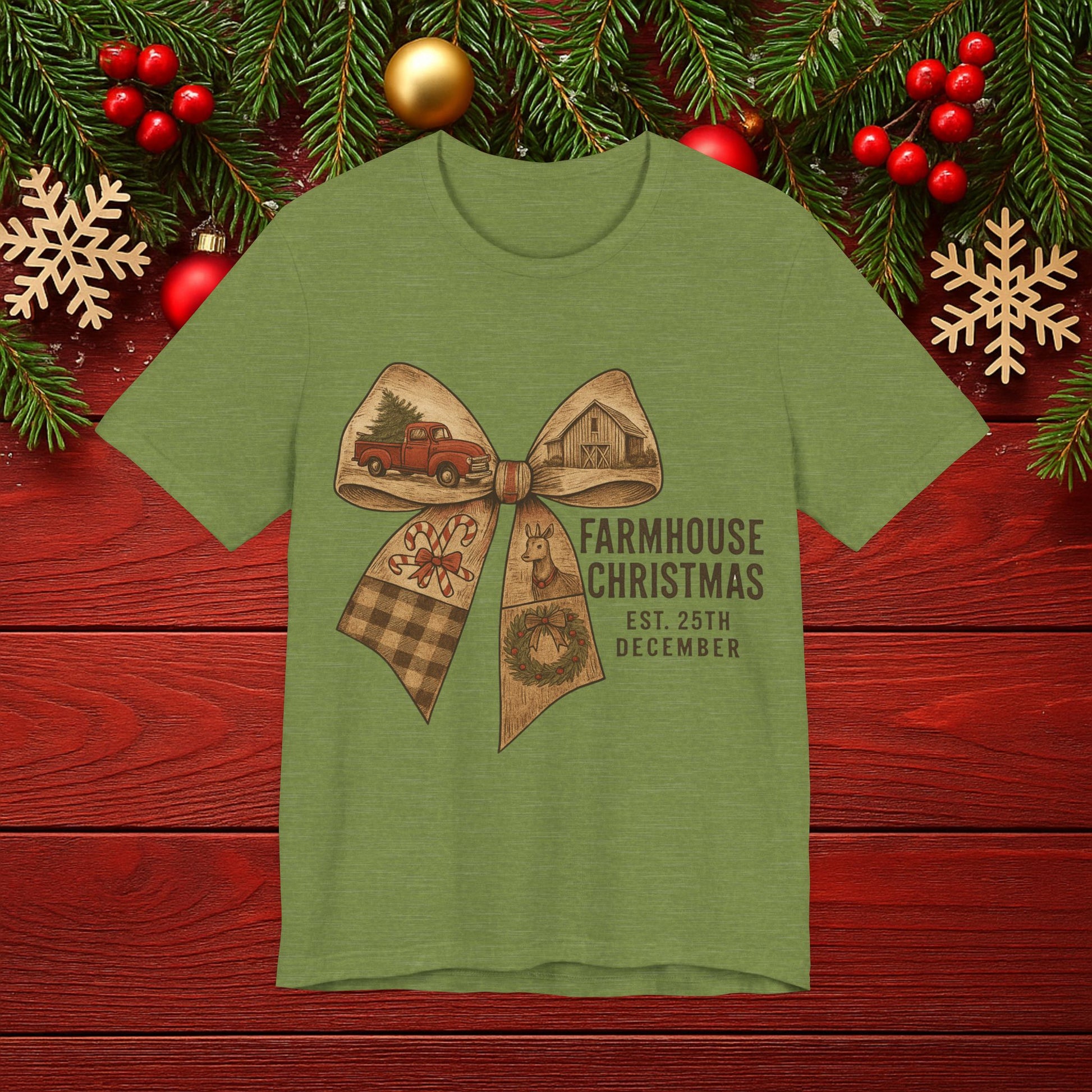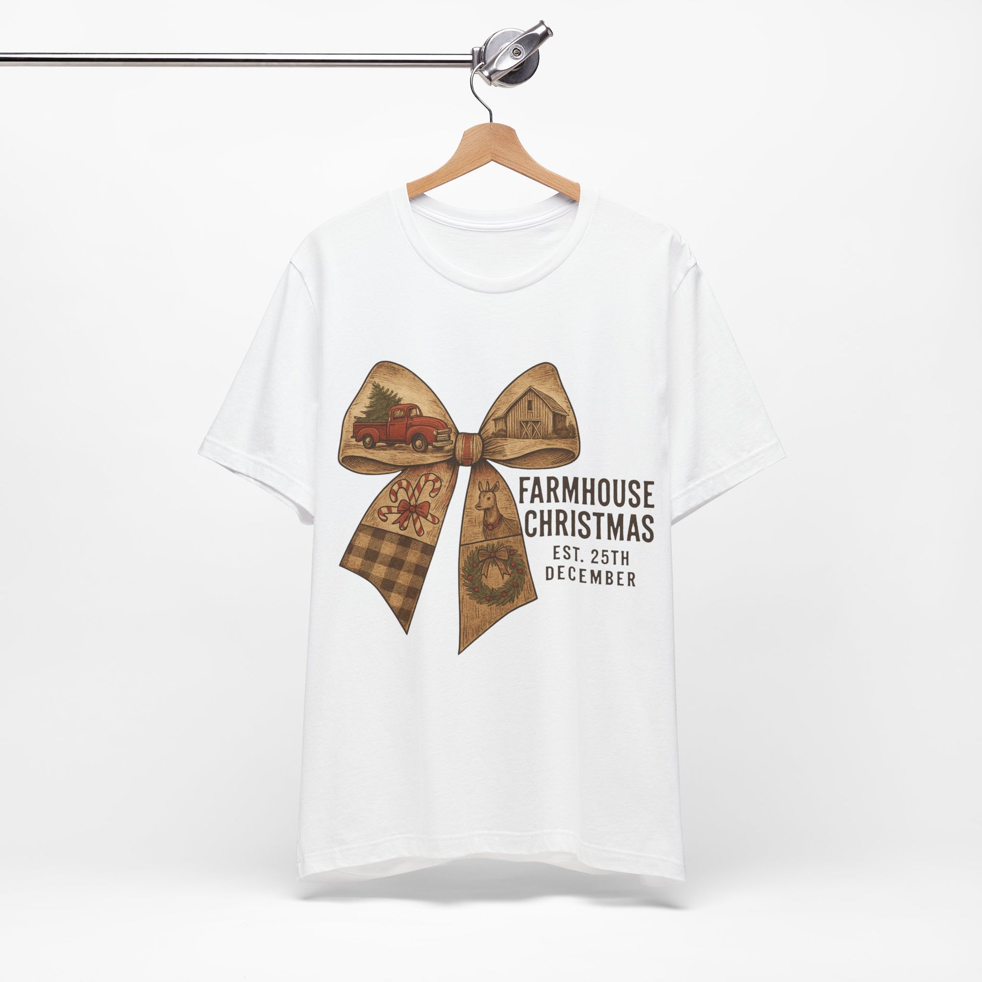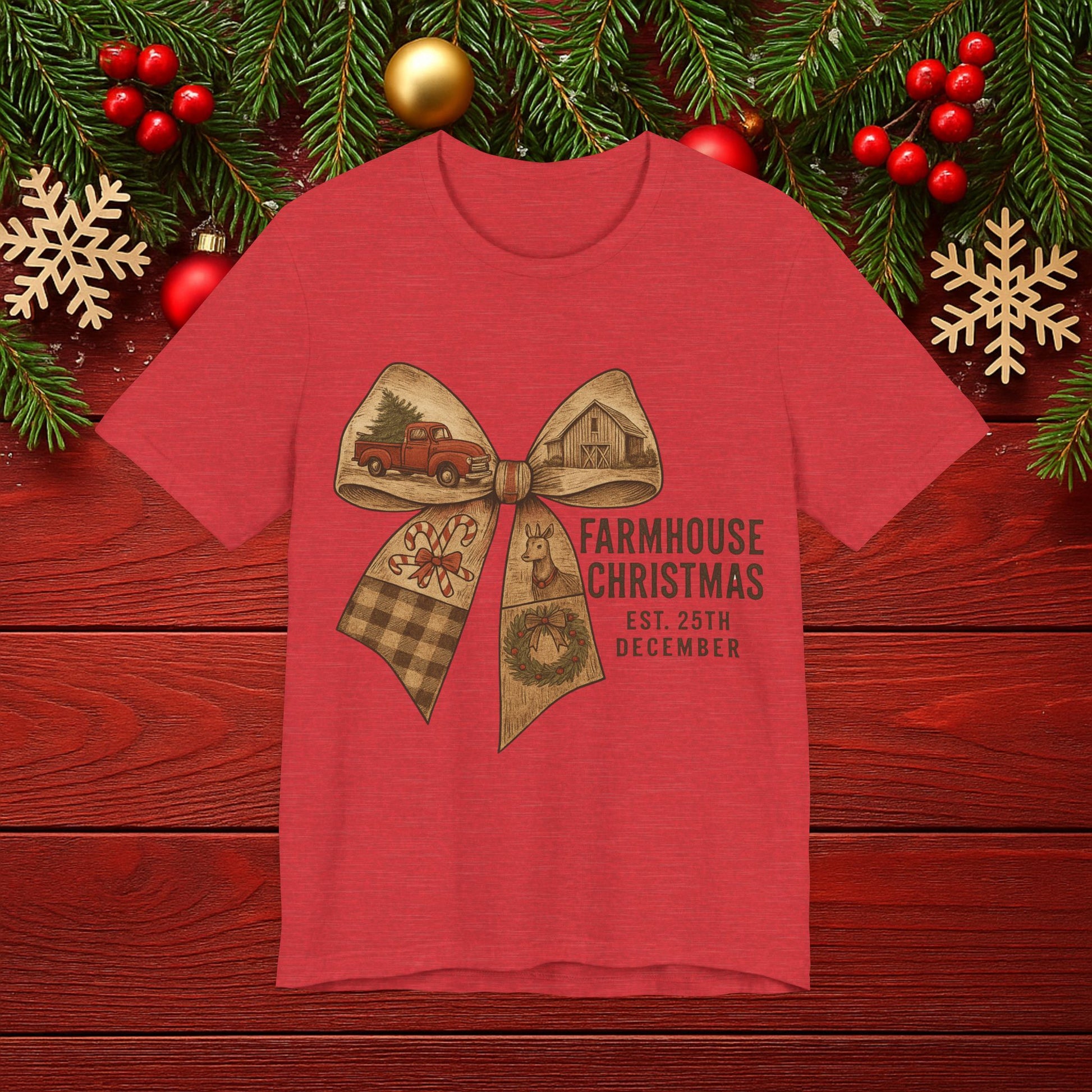 Farmhouse Christmas Tee – Rustic Bow 'Farmhouse Christmas EST. 25th December' Holiday Shirt