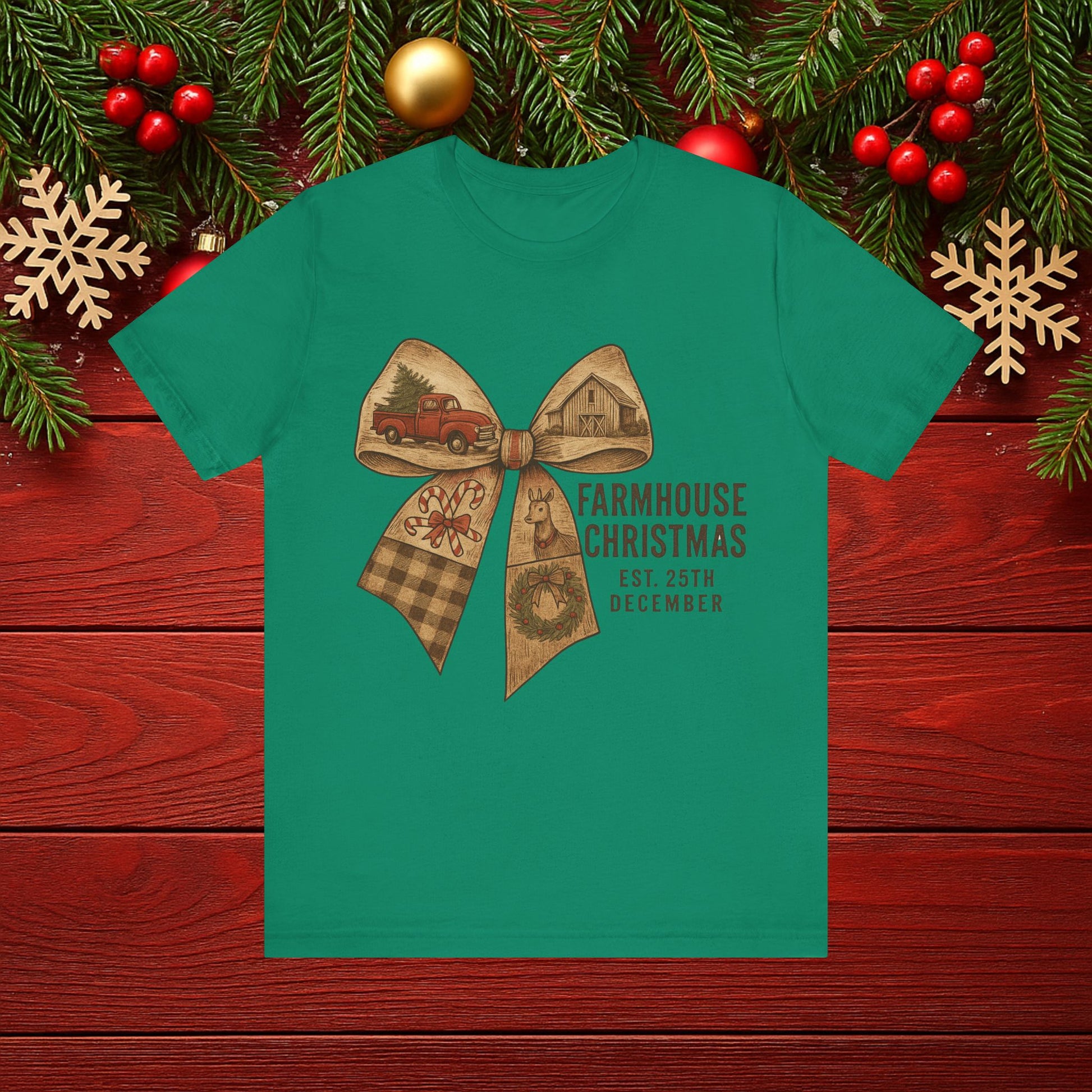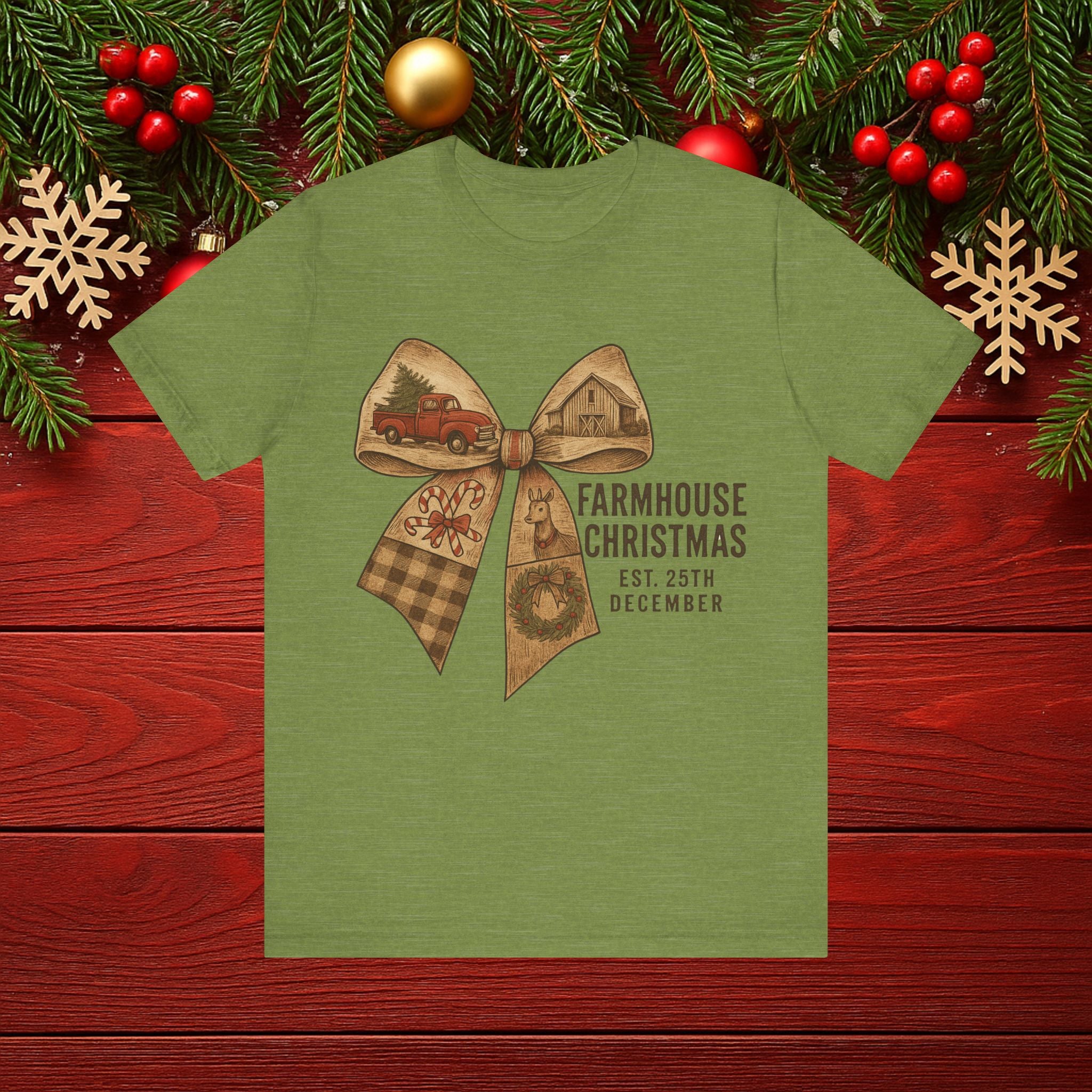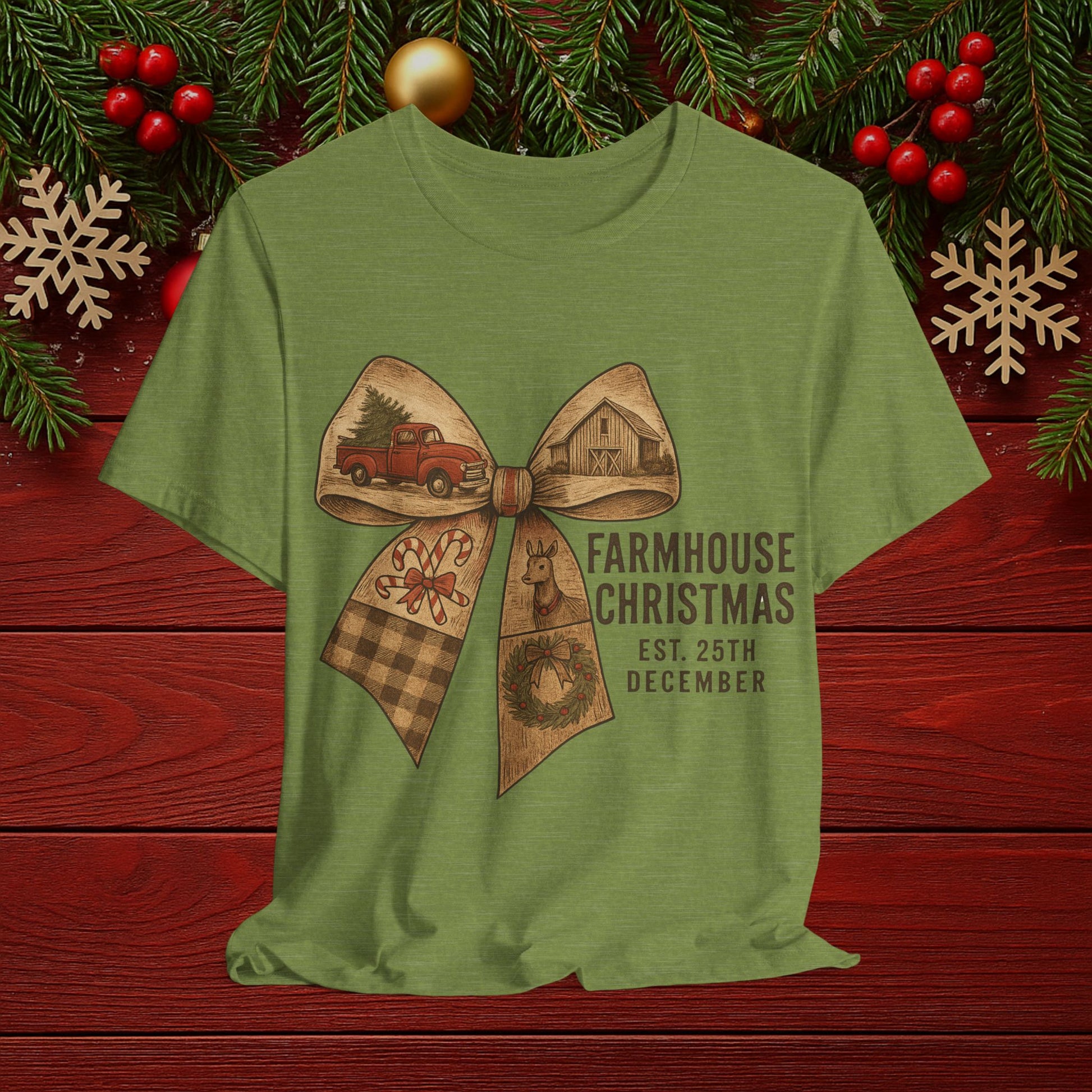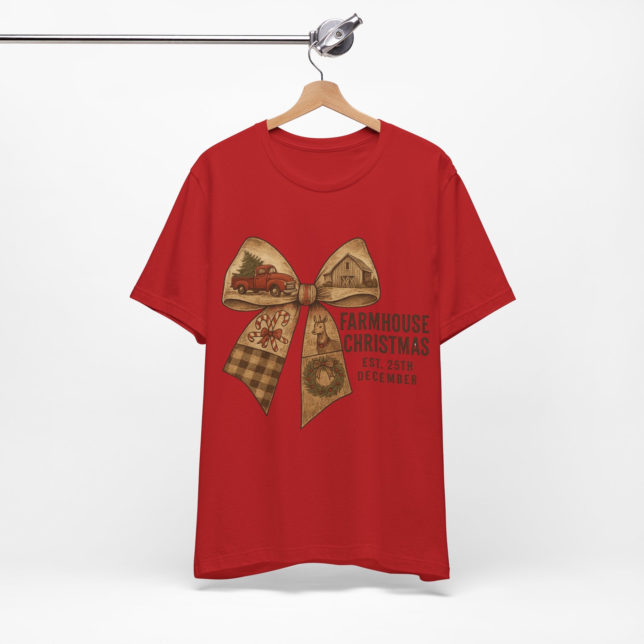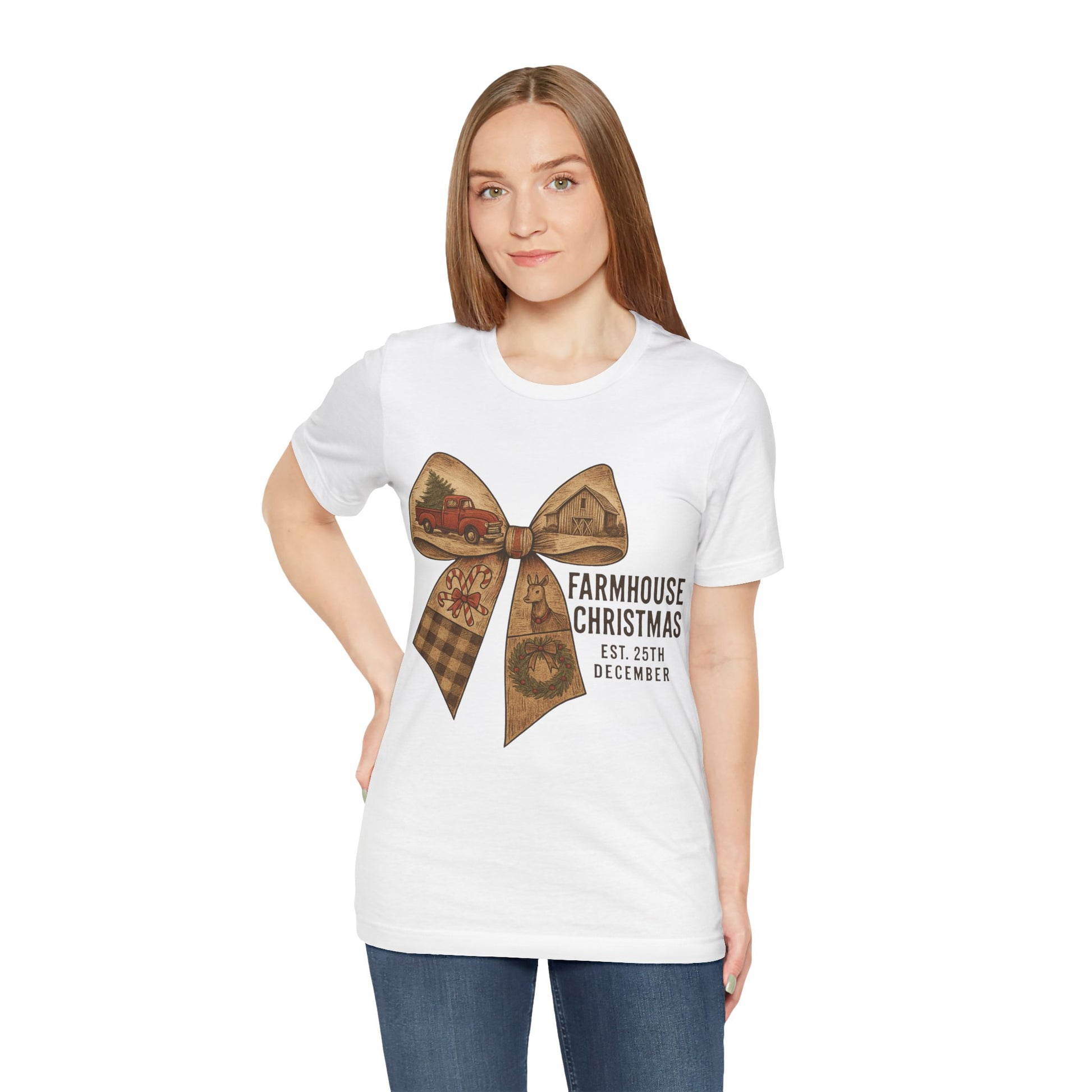 Farmhouse Christmas Tee – Rustic Bow 'Farmhouse Christmas EST. 25th December' Holiday Shirt