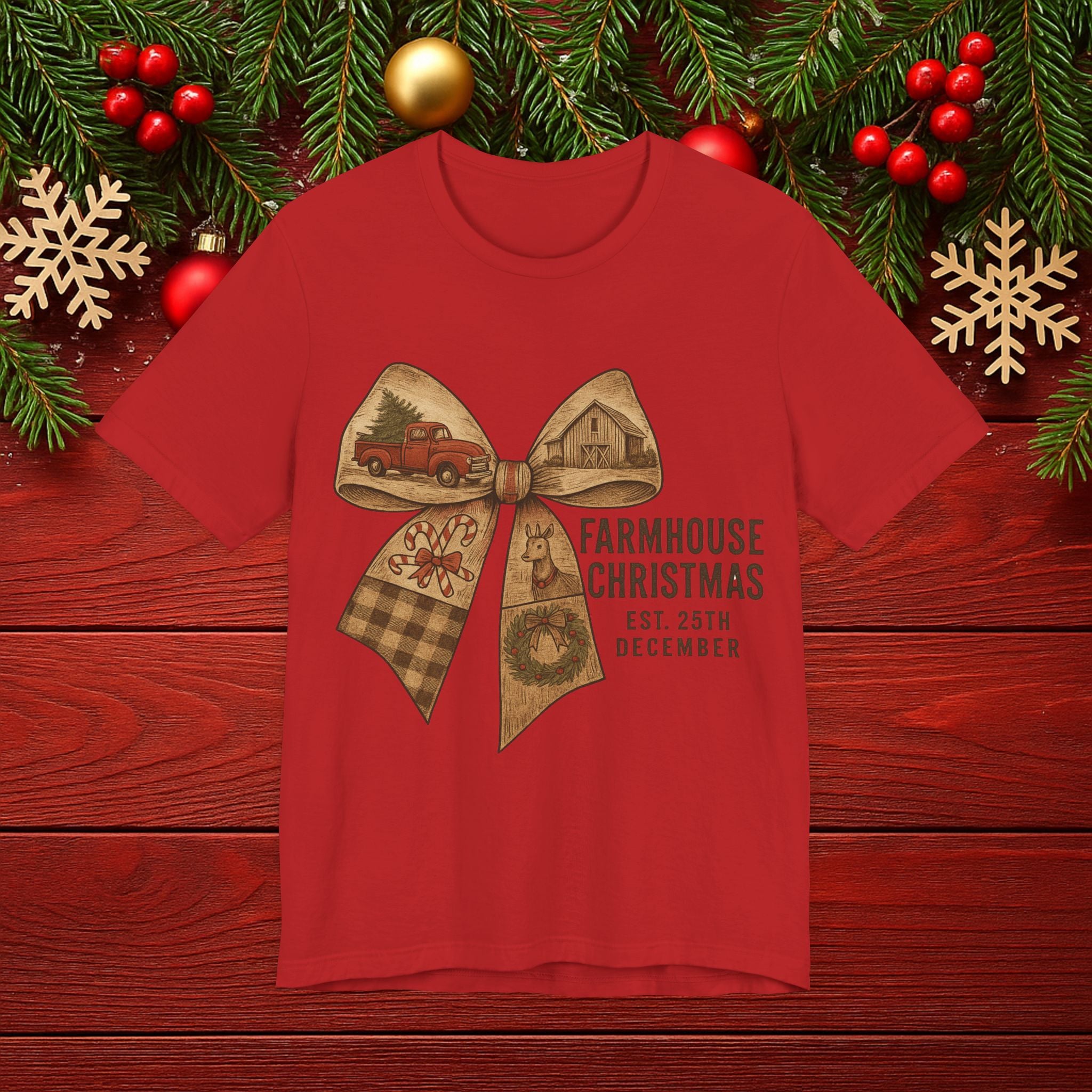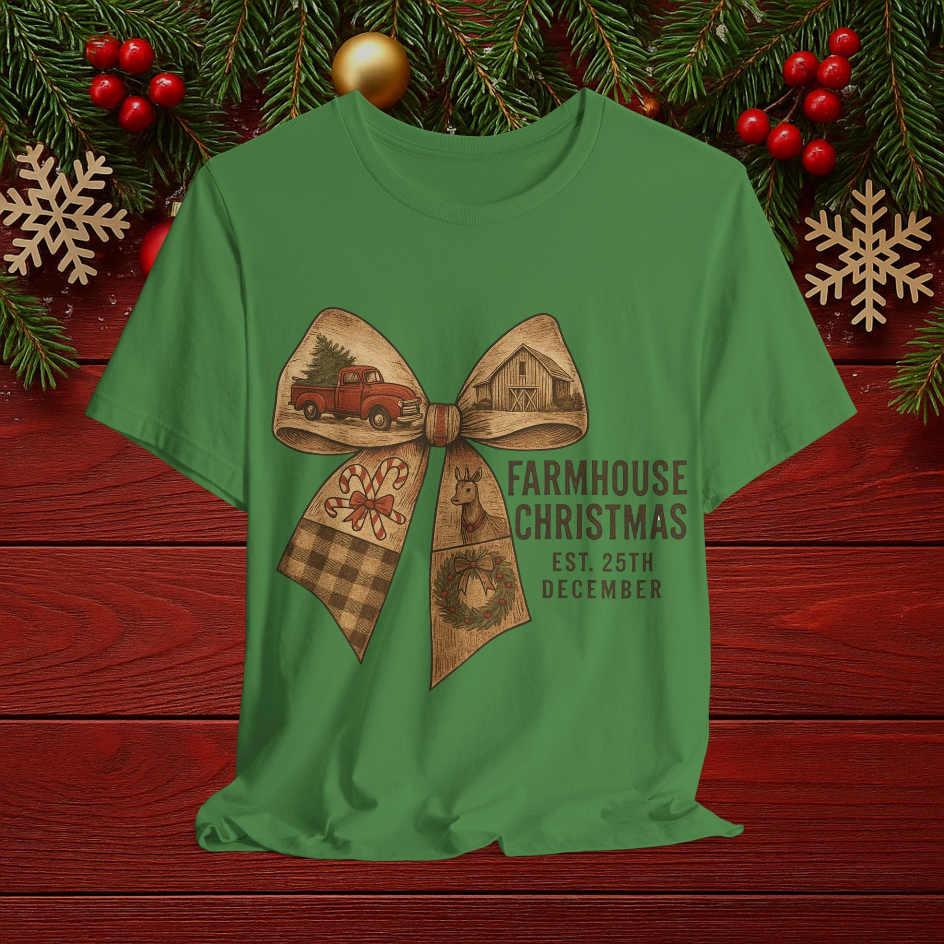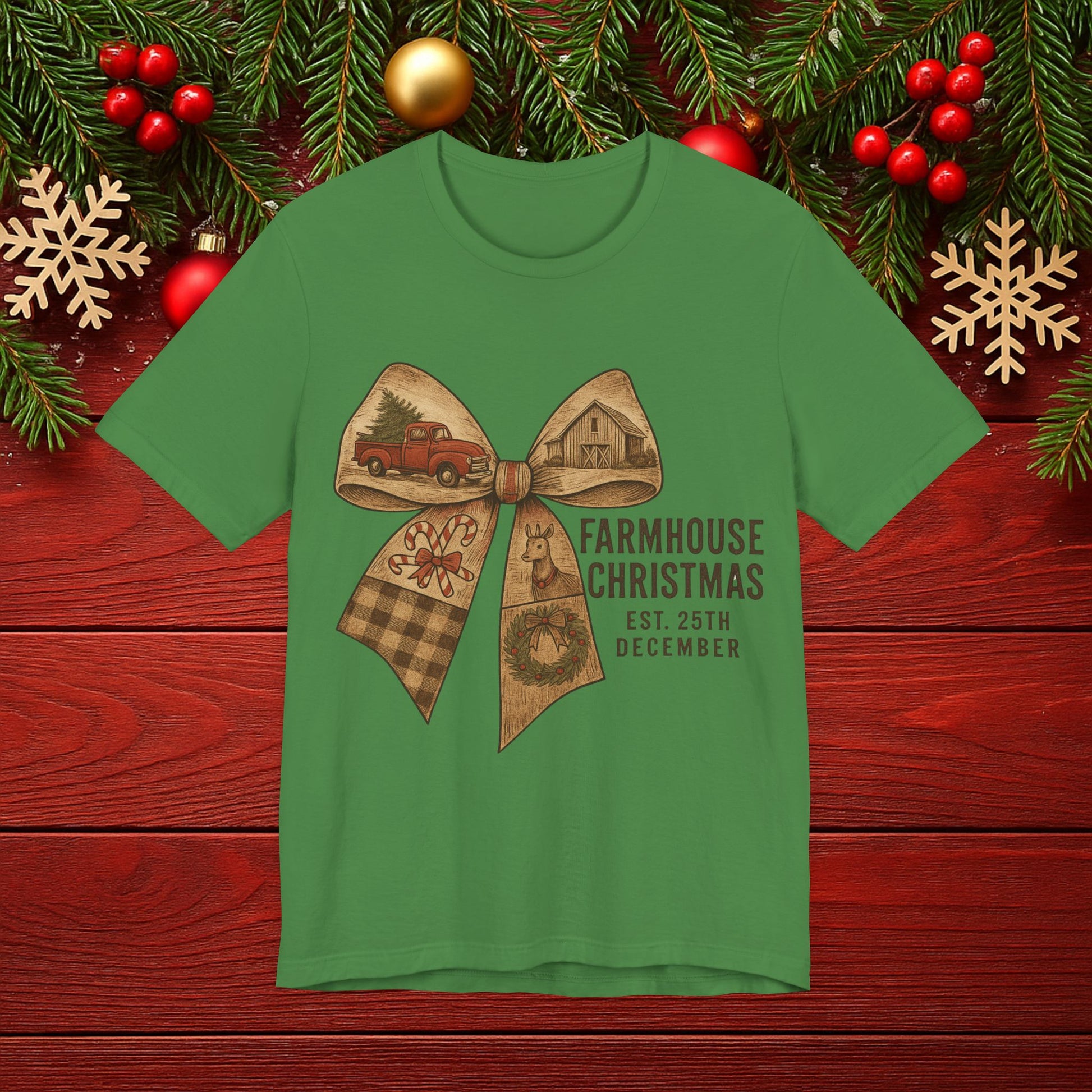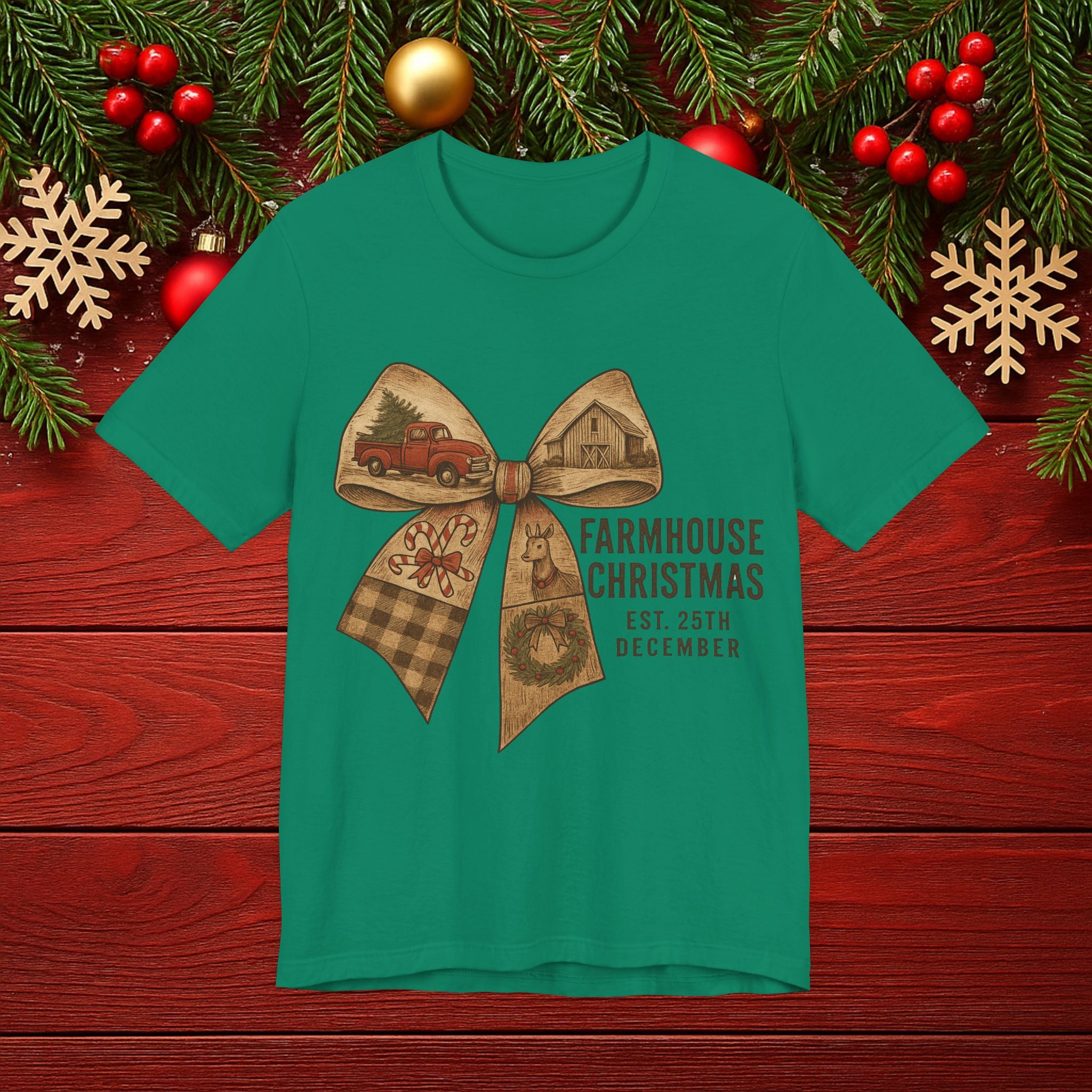Farmhouse Christmas Tee – Rustic Bow 'Farmhouse Christmas EST. 25th December' Holiday Shirt