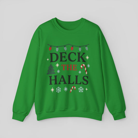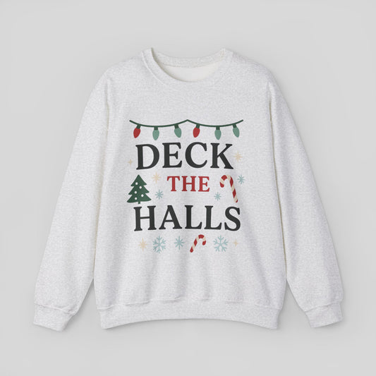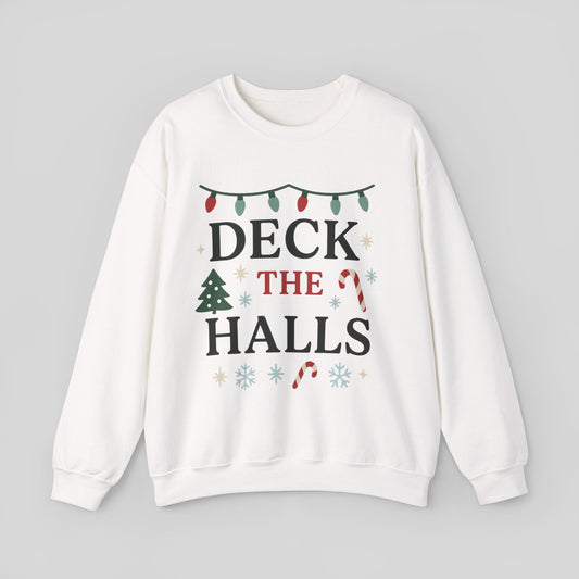 Deck the Halls Christmas Sweatshirt — Festive Holiday Crewneck with Lights & Candy Canes