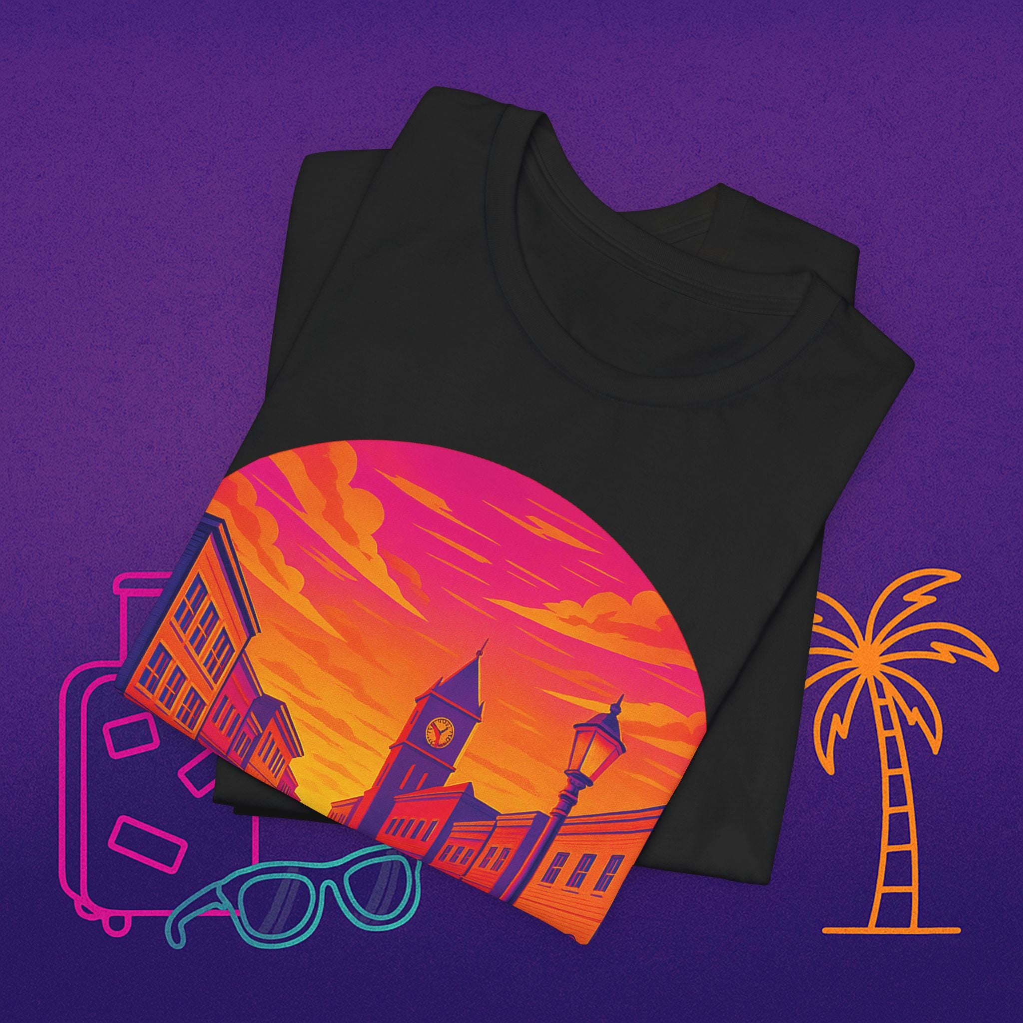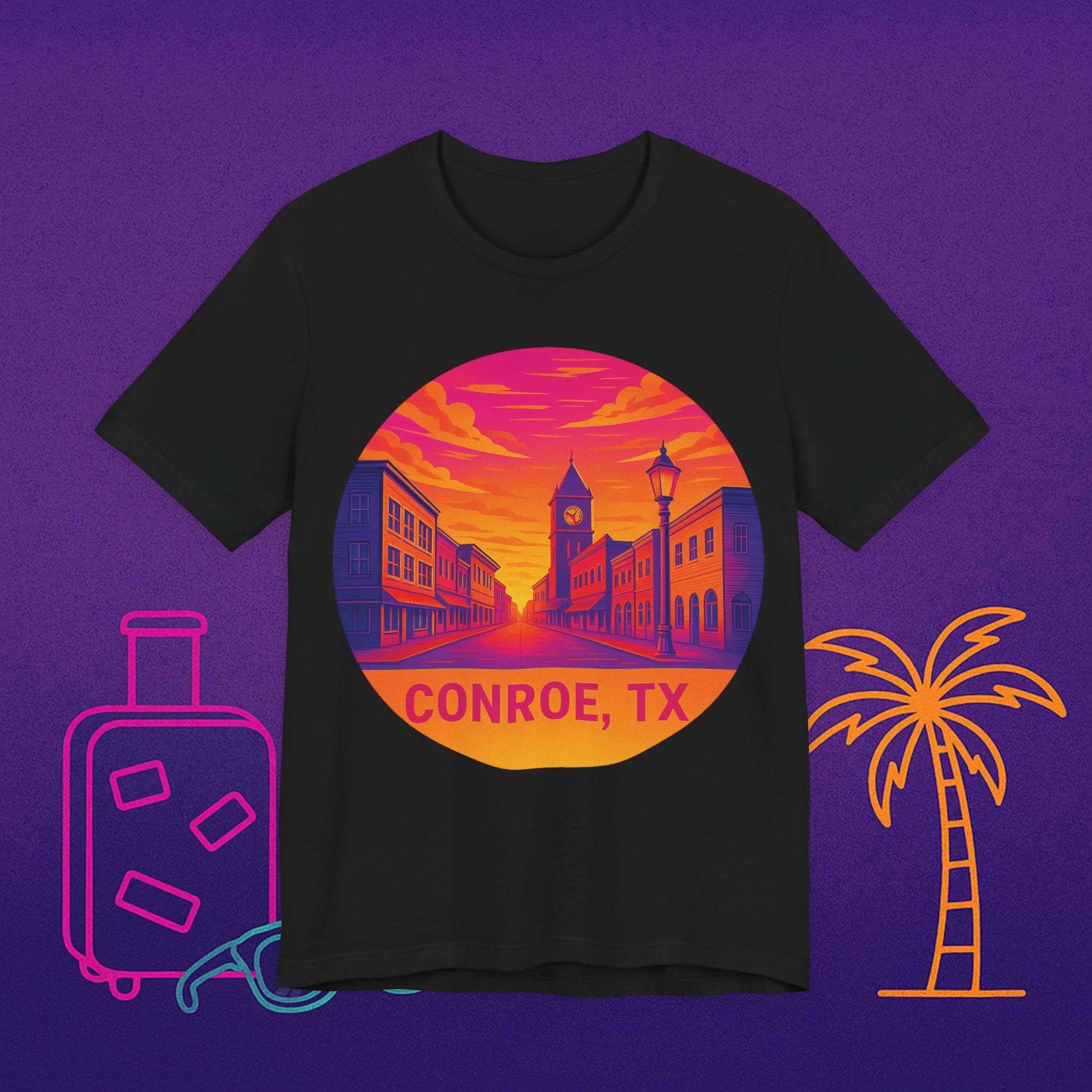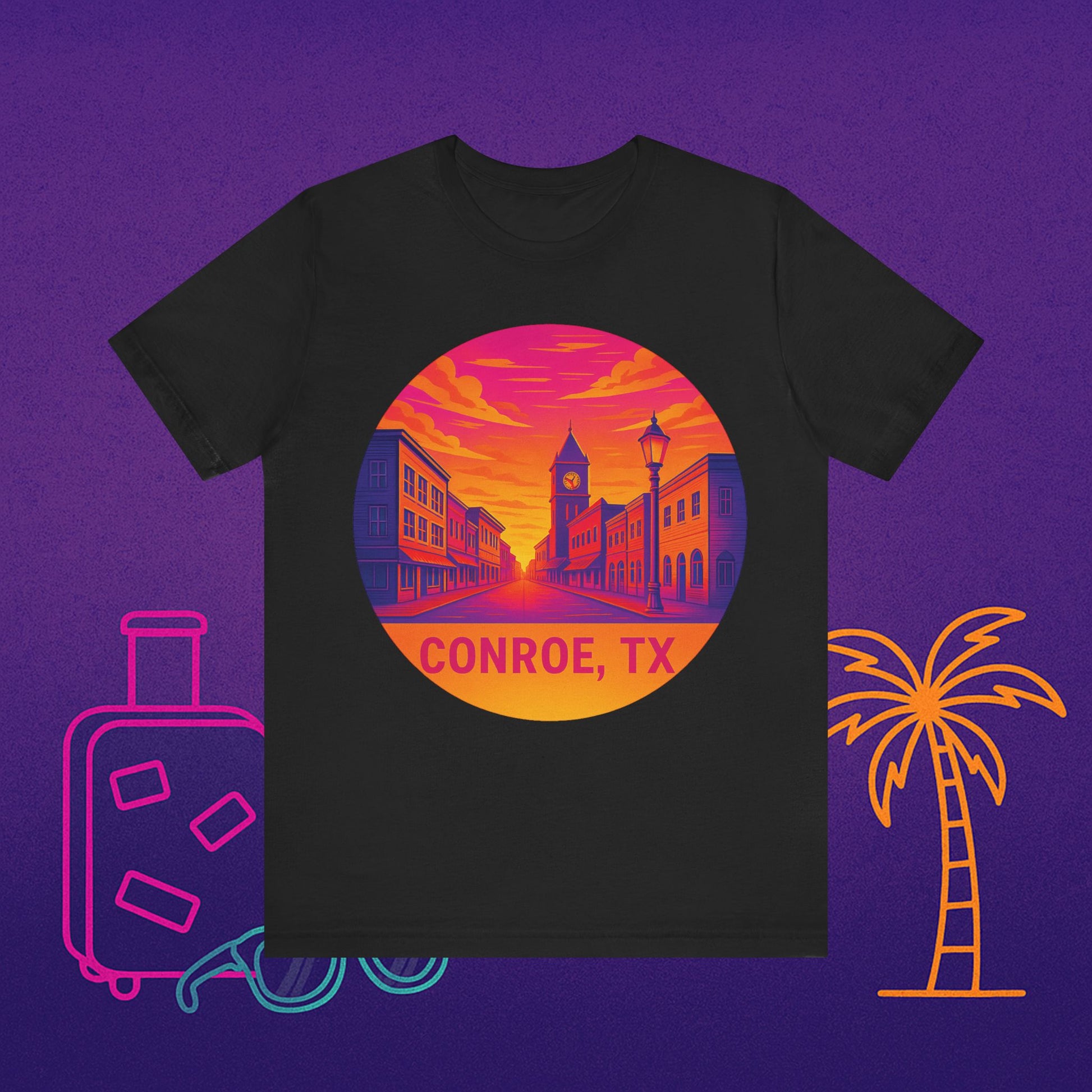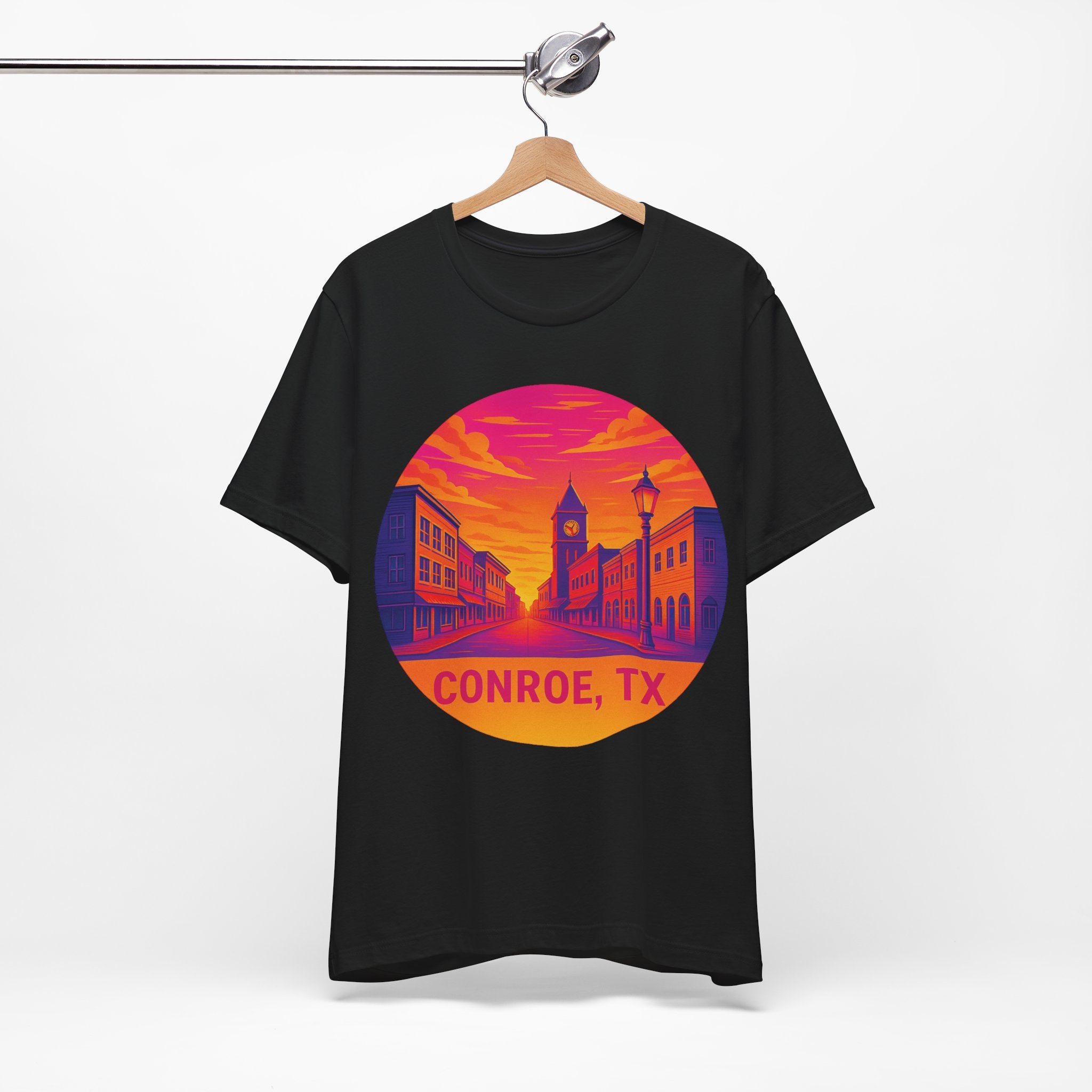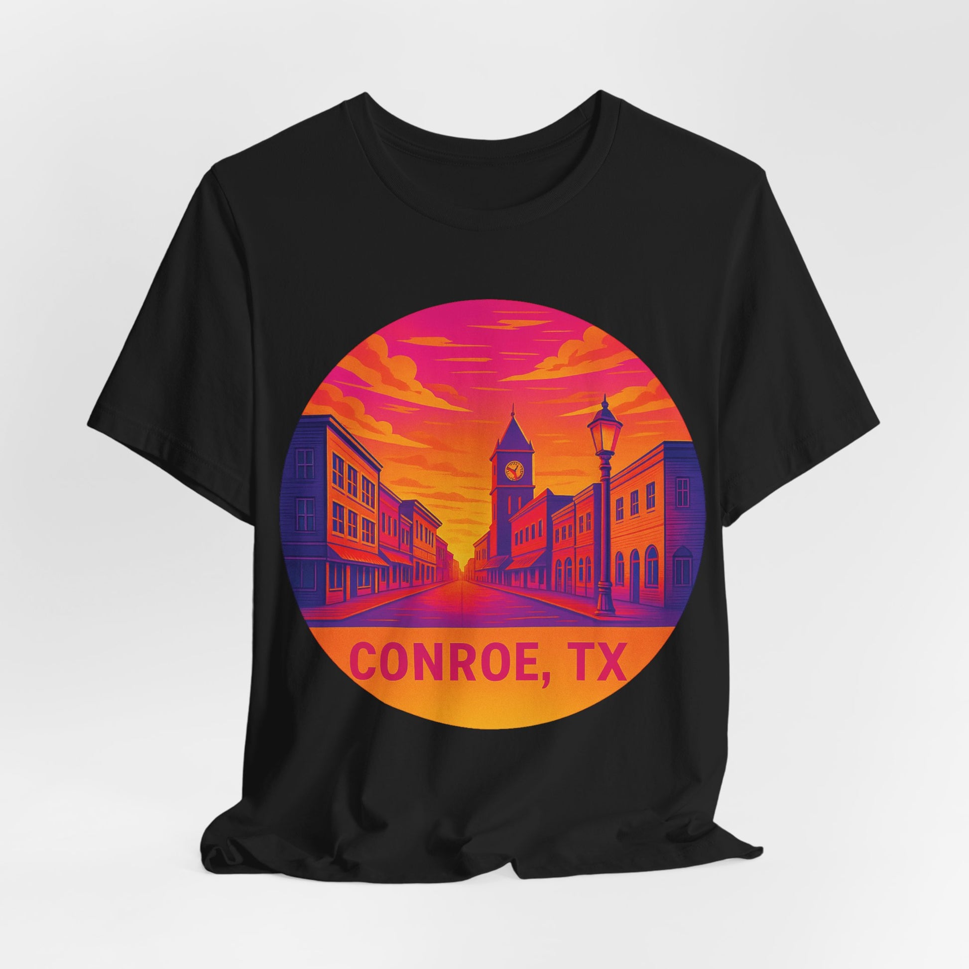 Conroe, TX Sunset Tee — Retro Downtown Scenic Graphic Shirt